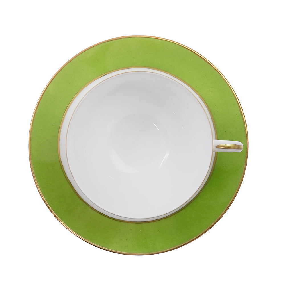 カップやプレートを縁取る金彩は、金の中でも特に純度の高い24金が使用されており、立体感のある金のレリーフが特徴です。