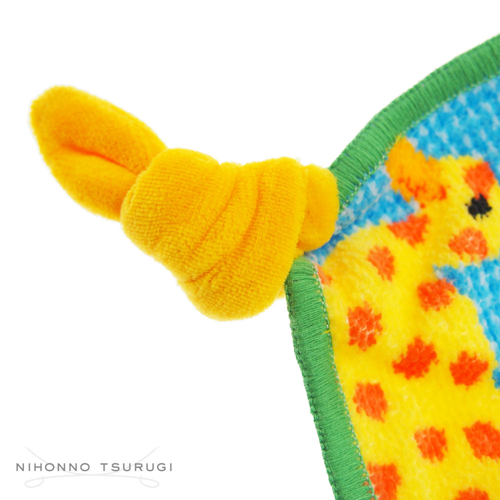 こちらはベビー用のコンフォーターで、結び目のようになっている部分は、赤ちゃんの"にぎにぎ”としてお楽しみいただけます。